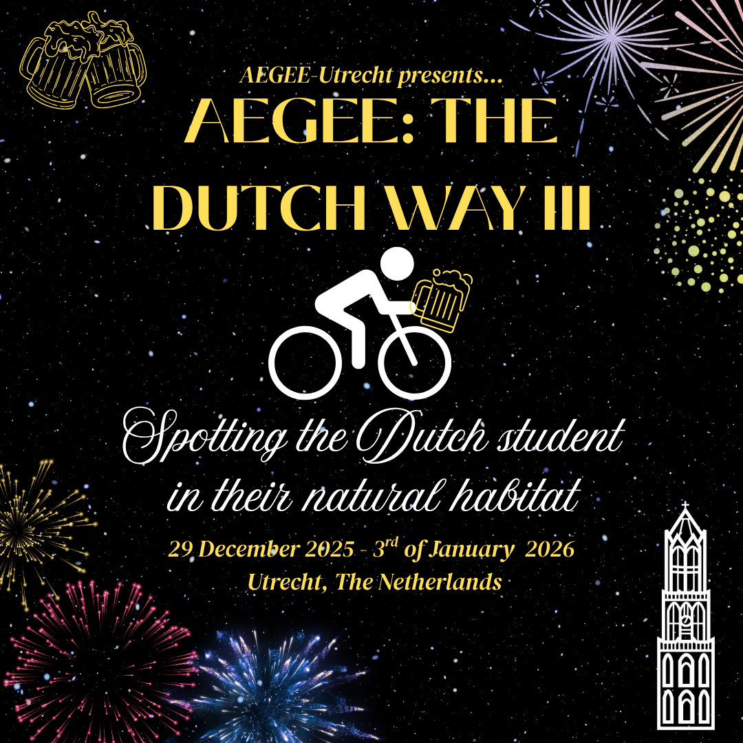 We are back with the third volume of AEGEE the DUTCH way, and the third time’s the charm!!🍀3️⃣ So if by now you still have not yet heard of the Dutch student, this is your chance🕵. An eccentric animal…🐅🌴, a species of their own.…. 🔍THERE!!!! We’ve spotted one!🔍 Over there, look at all the weird activities it is doing. A life of its own, oh so different from your standard boring Dutchman 😴. Associations, traditions, parties, games, you name it!!! During this NYE, you will discover not one, but TWO cultures! Our national, AND our student culture. 😮😮 The Netherlands is known for its unique culture, but student customs are another story. We will share some mind-blowing customs that will demonstrate a whole new level of Dutch ‘gezelligheid’ 😵. These include themed nights, drinking games, our famous singing party (cantus!) and much more 🍻🍻🍻. Besides that, our national culture has many cool (New Year's) traditions worth discovering. You will get to make our famous New Year's food, do the traditional New Year's dive in the North Sea, meet the original Saint Nicholas that we call Sinterklaas, go ice skating like the Dutchmen of the past, navigate through the typical Dutch canals🏰🌊 etcetera. And of course, because we’re going all Dutch, we will do everything by bike! 🚲🚲🚲